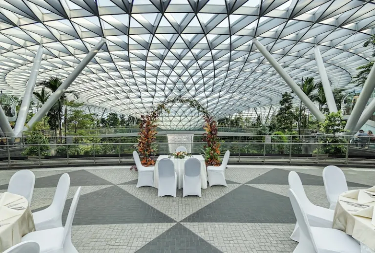 In case you need a venue or you know a couple who does, why not consider Changi’s Cloud 9 Piazza? Here, you get to say your vows in front of the HSBC Rain Vortex on the highest floor of Jewel Changi Airport. This venue can also accommodate 200 guests and provide you with botanical decorations.