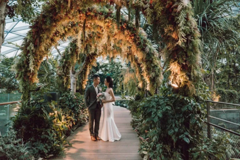 The Canopy Park at Jewel Changi Airport is another great venue for a Singapore wedding. It’s quieter and also more romantic. The couple and their guests will be surrounded by arches festooned in vines, flowers, and greenery. Everyone can take pictures at the charming Topiary Walk too.