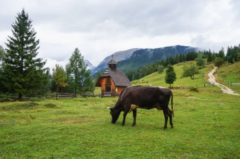 13. Grazing cow and a small chapel on the Pokljuka Plateau in Triglav National Park