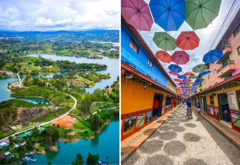 A rainbow-painted town awaits just east of Medellin, Colombia! Guatape is nothing short of a photographer’s paradise: cobblestone streets wind past vibrant homes adorned with beautiful zocalos, a type of embossed design. Pretty much every corner explodes with colour, with painted staircases, balconies, and even window frames.