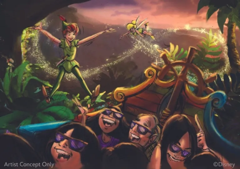 This attraction brings guests on an epic adventure through Never Land. With Peter Pan, Tinker Bell, and the Lost Kids, guests will embark on a mission to rescue John from Captain Hook and his band of pirates. The ride features key characters from Peter Pan including Wendy, Michael, the mermaids, Tiger Lily, and more. This ride is about six minutes long.