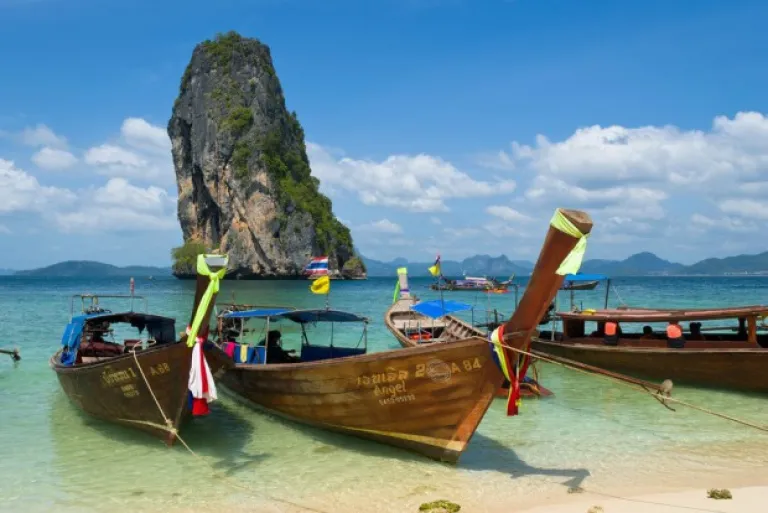Dramatic limestone cliffs plunge into the Andaman Sea, framing idyllic beaches and hidden lagoons. Krabi is a paradise for rock climbing, island hopping, and simply soaking up the stunning coastal beauty, with iconic longtail boats dotting the horizon.