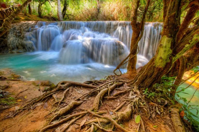 Cascading turquoise waters tumble over limestone formations, creating a series of stunning tiered pools perfect for swimming. Surrounded by lush jungle, these falls near Luang Prabang are a refreshing oasis of natural beauty.