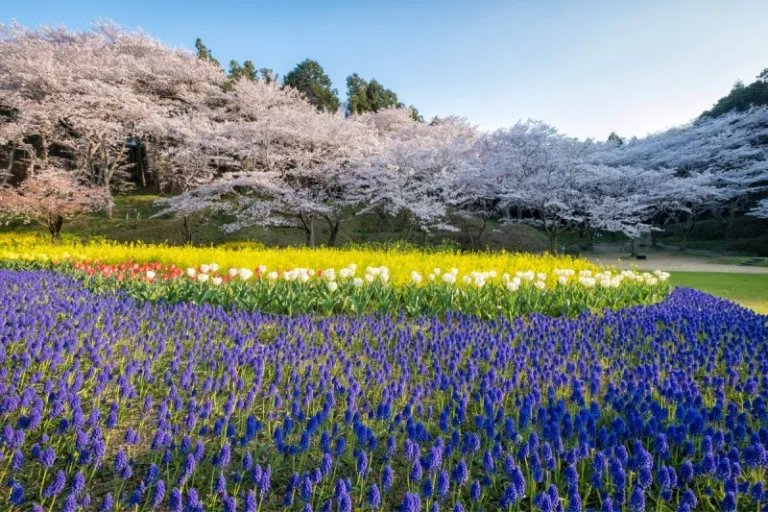 On the edge of Lake Hamana, a rainbow haven awaits in Hamamatsu Flower Park. Spring flower fields of azaleas, hydrangeas, tulips, and roses invite visitors for a stroll. Purple wisterias hang overhead, completing the picturesque scene.