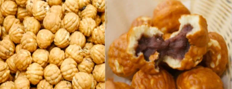 Hodo Kwaja is also known as 2-bite walnut cakes. It takes the shape of walnuts, and is filled with red bean paste and walnut bits. Hodo kwajais great for when you’re on the go and want something convenient and easy to eat. Think the fluffiness of kueh balu, the density of a pancake, the sweetness of the red bean paste, and the crunchiness of walnuts. Perfect.