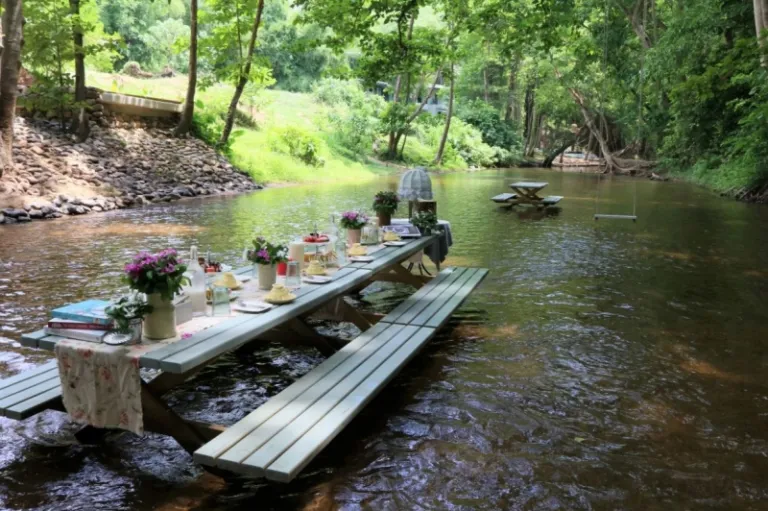 At the end of our walk, we were greeted with the most glorious sight; a high tea spread on the river! Flowers, coffee table books and yellow teacups were meticulously arranged on the turquoise wooden bench table. The set-up looked like it jumped out of a Pinterest board! The icing on the cake had to be the swing in the background.