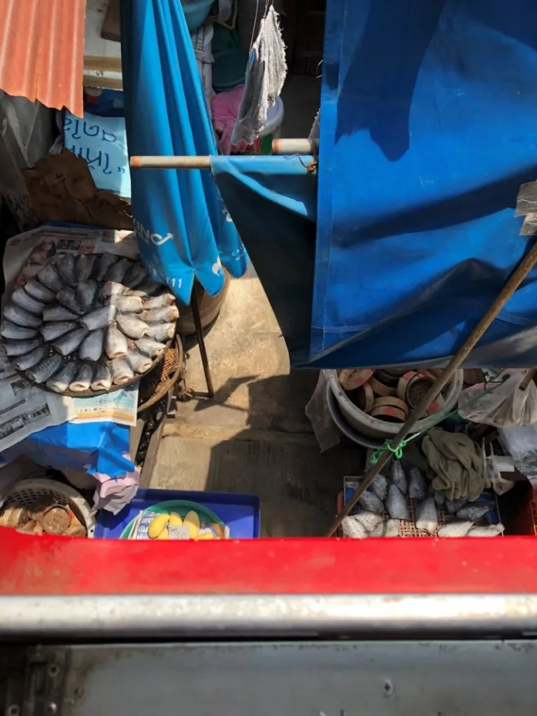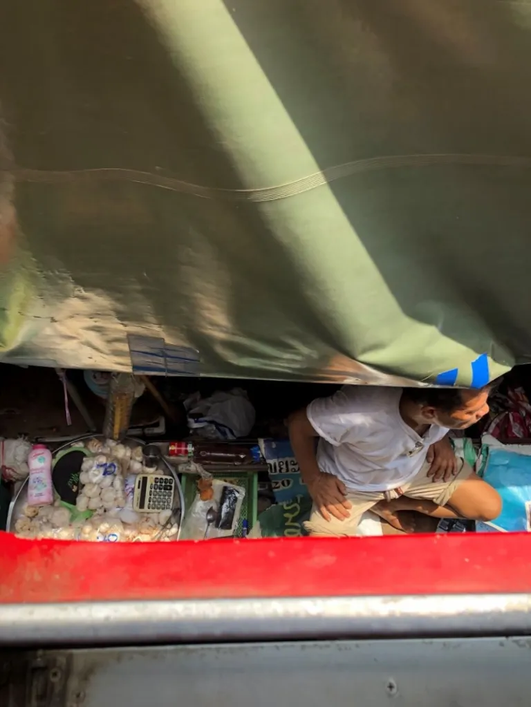 We were perched on the window sills the whole journey from Ban Na Khwang Station to Maeklong Station. The train slowed down considerably as we approached Maeklong station. We cautiously popped our heads out of the window and were shocked to see how close the train was to the stalls. Some of the produce that was laid on the ground was literally underneath the train!