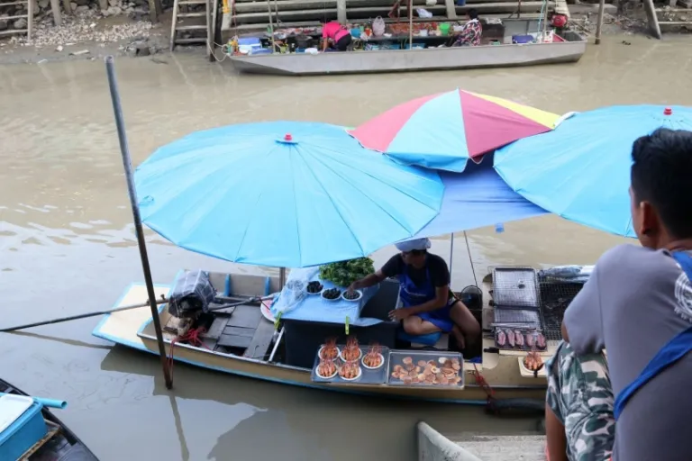When in Amphawa, you simply must drop by the famous . We were dizzy with excitement as we hopped on the boat to make our way to the floating market. We also caught a glimpse of the local life as we saw locals fishing for river prawns and children playing in the river.