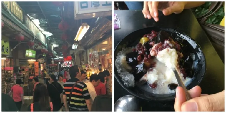 Left: At Jiufen Old Street 九份老街; Right: Jiufen’s signature handmade yam balls (we also ordered pumpkin and black sesame balls, all equally chewy and tasty) 九份手工芋圓 paired with ice, fresh milk, red beans and glass jelly. Yummy!