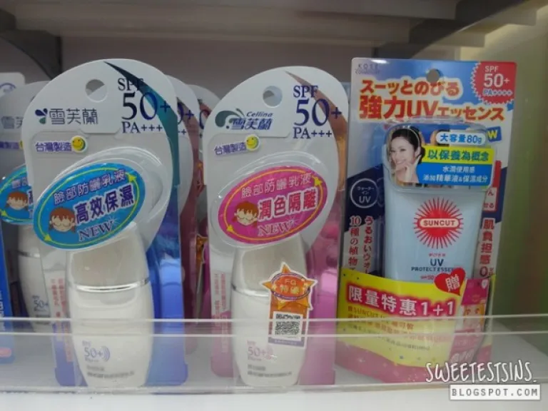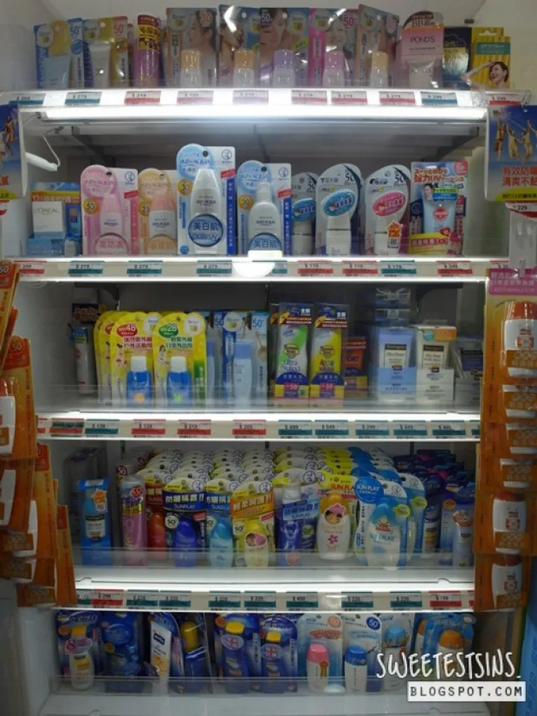 The last section that I checked out was – sunblock and sunscreens. A must-have in Taiwan especially during summer! We all applied and reapplied sunblock religiously every other hour because the sun was scorching hot. Even so, my cousin, Bing and I ended up with watch tan-lines. Eeks, hope it goes away soon because it looks so ugly. T_T
