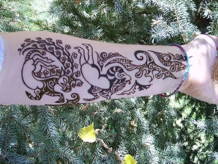 A Scythian-style tattoo is rich in design techniques, forms and complex patterns. The animals drawn include a mixture of traditional decorations from various nationalities.