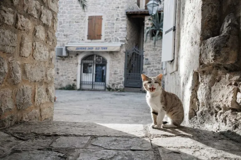 Prowl amongst street cats in old town alleys in Budva, Montenegro