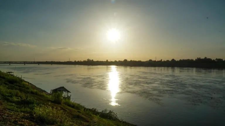 Watching the sunset at the riverside. The friendship bridge that connects Thailand and Laos can be clearly seen in the distance