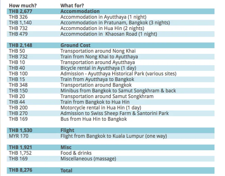 A comprehensive itinerary that’ll take you every step of the way, from Ayutthaya, Bangkok and its surroundings, to Hua Hin. Trip expenses included!