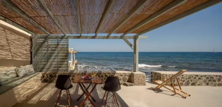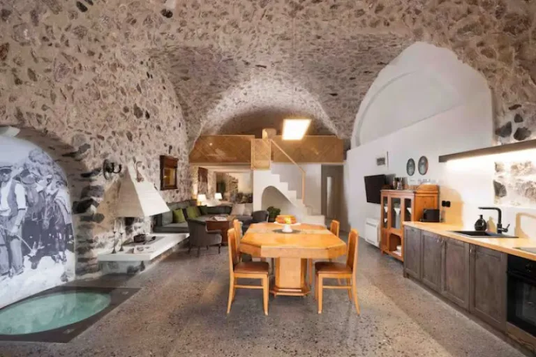 Just steps from the water, this cave dwelling once housed a local fisherman and his boat, now lovingly restored into a private retreat. The minimalist decor highlights the natural stone architecture while modern amenities ensure comfort. Perfect for couples and honeymooners, the property offers a rare chance to stay directly by the sea in Santorini, away from the island’s busier spots. Its serene location and connection to traditional island life make it one of the most unique Airbnbs in Greece.