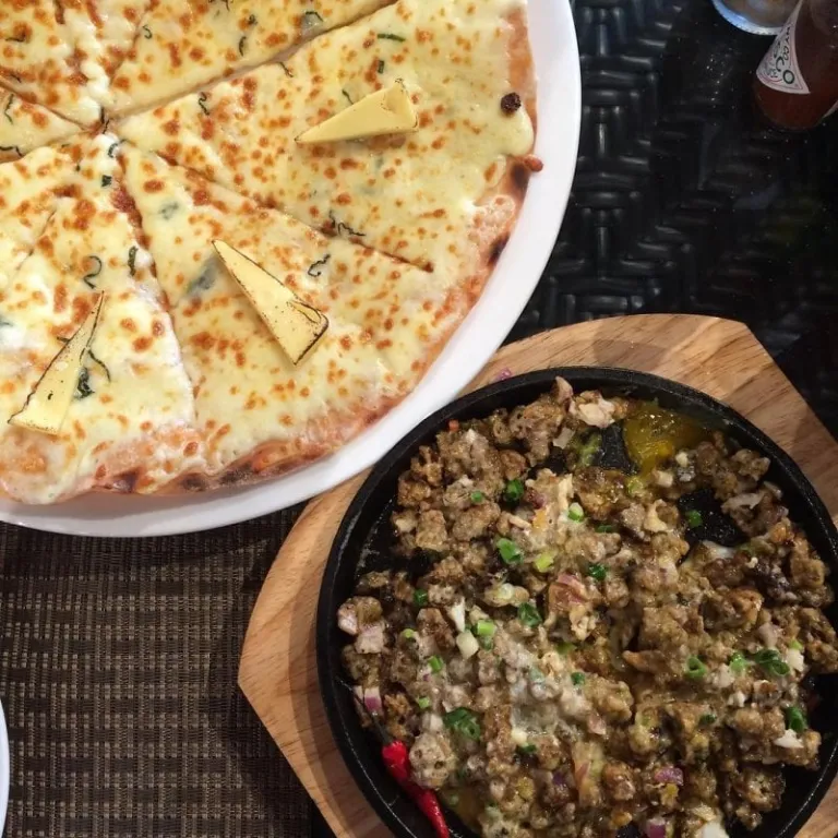 Four-cheese pizza and oyster sisig