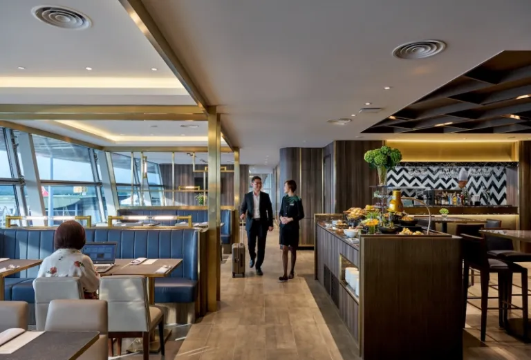 This lounge features food and beverage with vegetarian options, a bar, lounge bay, charging station, and even shower facilities! Seems like everything you could need in a lounge, right? But it gets even better.