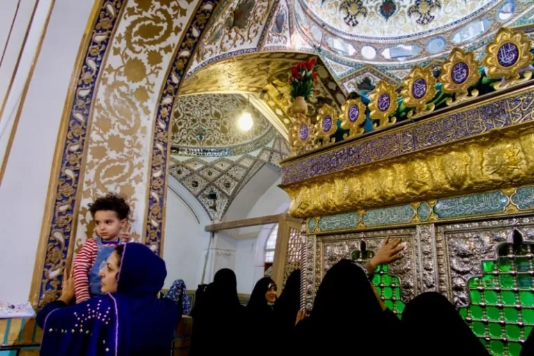 Chador-clad women touching the tomb.