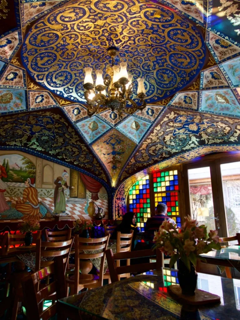 The intricate blue and gold ceiling is the star of the show in Bahar Narenj Cafe.