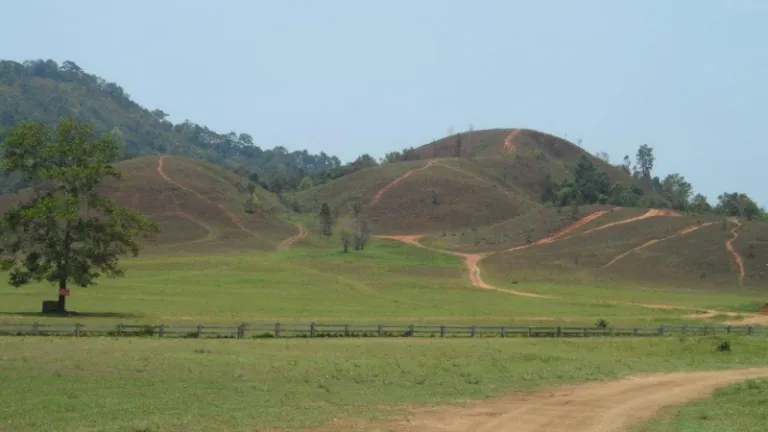 Ranong’s Bald Hills are an unusual sight alongside a major road—a few grassy hills stand out for being almost entirely devoid of trees and shrubs, unlike the surrounding hills, mountains, and fields. Nobody knows why plants fail to flourish on these particular mounds.