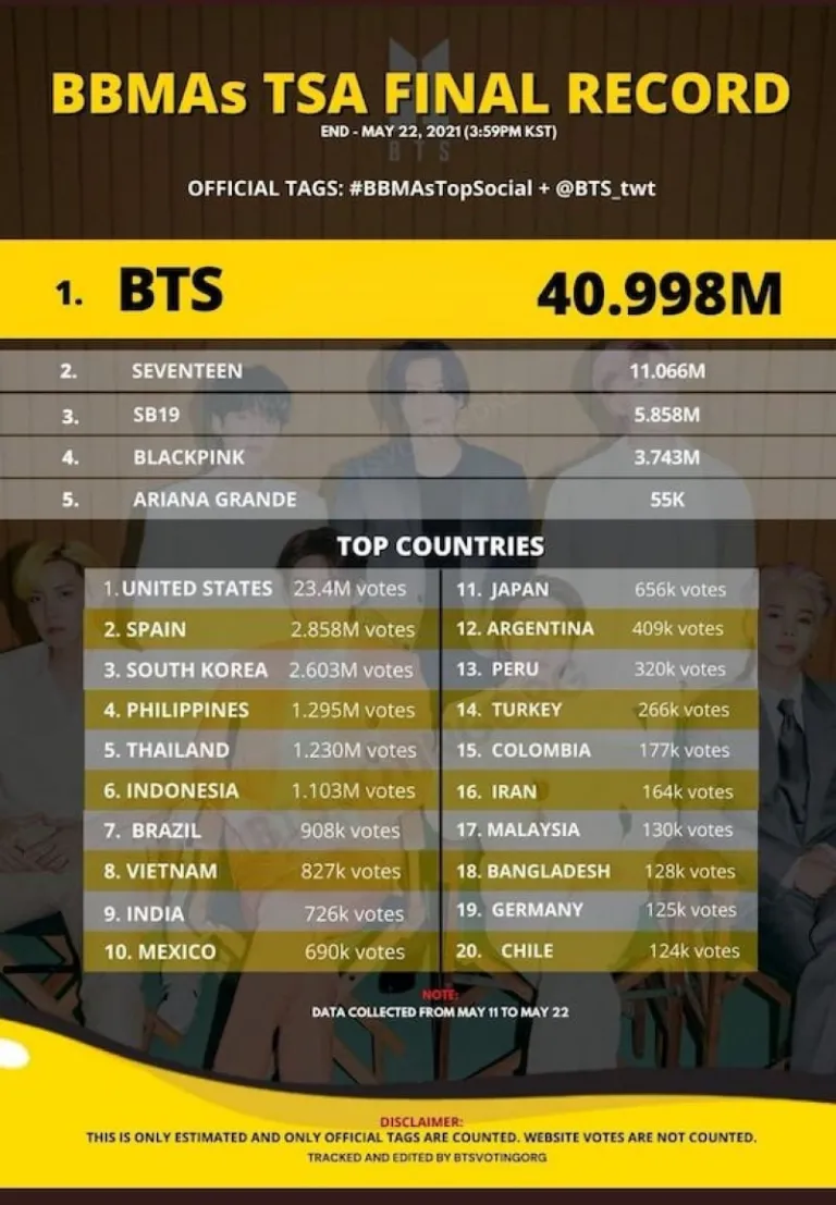 It came as no surprise when BTS won against everyone by a landslide; but if you look at the estimate of the tallied votes on Twitter (excluding website votes), SB19 fans put up a fight. While BTS placed first with almost 41 million votes, SB19 placed third with almost six million votes. The tallied votes from the Philippines only amounted to 1.2 million votes, which means millions of votes for SB19 possibly came from overseas fans.