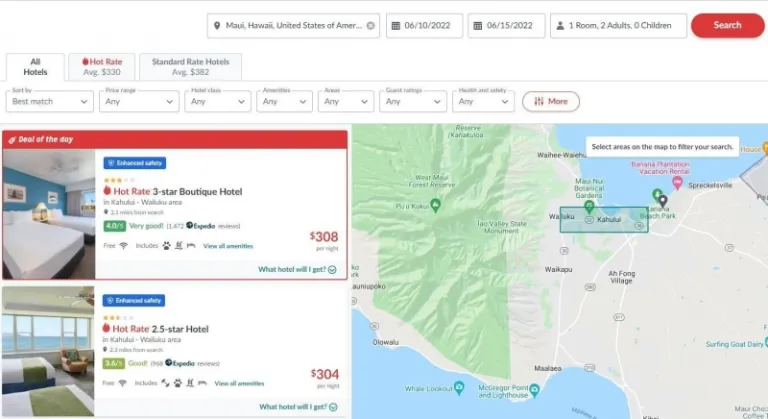 Go on Hotwire, and fill in the destination and travel dates. OK. We always wanted to visit Maui, so we entered this destination and chose dates in June. Press Find a hotel and look what pops up.