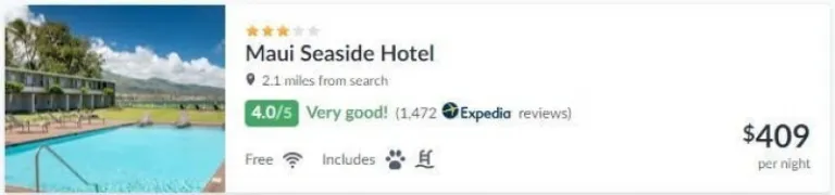 For starters, we’re just going to look at the ones with an overall score of 4.0. So for example, Maui Seaside Hotel has a rating of 4.0. And this is the only hotel from all 7 found depending on our dates.