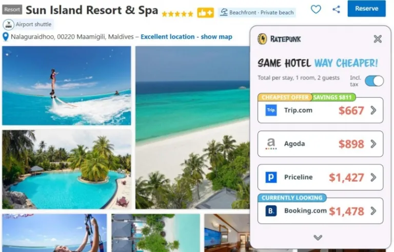 The next step – decide on the hotel or a resort you wish to stay at in the Maldives. Don’t pay too much attention to the price now. We selected Sun Island Resort & Spa. We knew this resort from people’s reviews, and that’s why we would love to stay there. Now, click to see more about the hotel. And see RatePunk extension showing you the results: