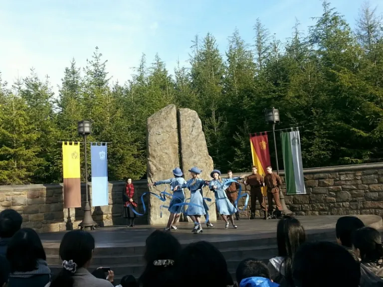 There are three street entertainment shows in WWoHP at different timings, all located at the performance area by the tracks of Flight of the Hippogriff. You should expect a huge crowd watching the performances. Queues start to form about half an hour before the shows start, so be sure to join the queue early in order to get the best seats in the house!