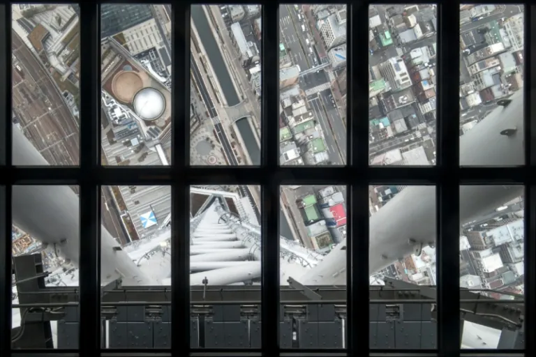 Next, we went up the observation decks for the next part of our one-day TOKYO SKYTREE guide. There are two observation decks: the Tembo Deck, which is 350 metres above ground level, and the Tembo Galleria, which is 450 metres above ground level. Here’s a shot from the Tembo Deck, 350 meters above ground level.