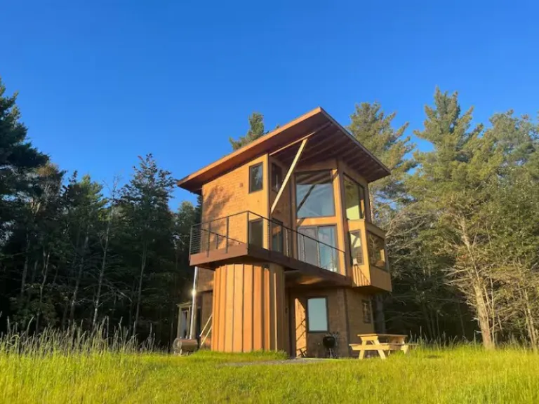 Located in Vermontville, this unique three-level chalet is designed for light, solitude, and sweeping views. With modern furnishings, a full kitchen, and a cedar hot tub on the deck, it’s the perfect all-season escape. Large windows bring the forest inside, and the space is ideal for couples looking for peace, privacy, and the occasional yoga session under the sun. A thoughtfully crafted base for winter adventure or summer stillness.