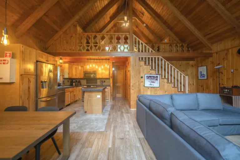 Tucked in the forest near Jay, this 1970s-built chalet offers a warm, rustic escape with a private hot tub and quick access to skiing, hiking, and mountain air. The two-bedroom home is ideal for couples or small groups and includes a full kitchen, spacious living area, and vintage Adirondack charm. It’s not a luxury stay, but it is a cozy one and perfectly suited for evenings under the stars after a day of mountain adventure.