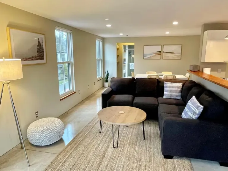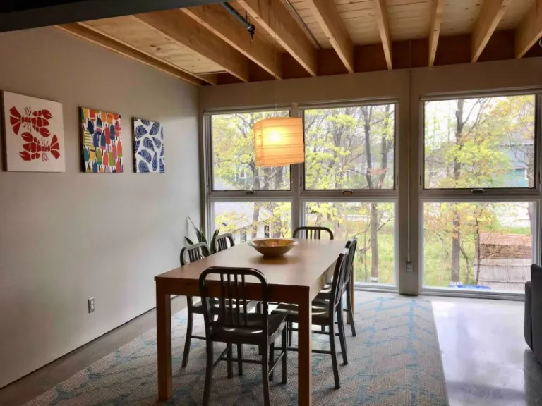 A contemporary loft that is ideal for those who love both comfort and convenience. Nestled on a quiet residential street, this airbnb in Bar Harbor offers a stylish open-concept living space with a view of Cadillac Mountain from the dining area. Located above a wood-fired restaurant, this rental puts you within walking distance of Bar Harbor’s best restaurants and shops. The two-story loft features a fully equipped kitchen, a cozy twin bedroom, and a spacious king bedroom ensuite, making it a fantastic choice for families and groups.