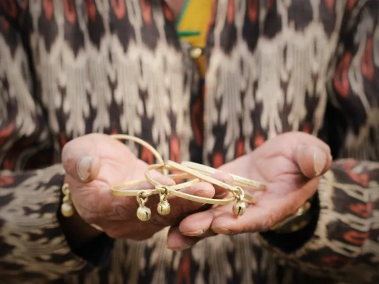 T’boli brass jewellery held by an artisan garbed in T’nalak or T’boli dream weave. | Image credit: Gabs Sagaral | Sesotunawa