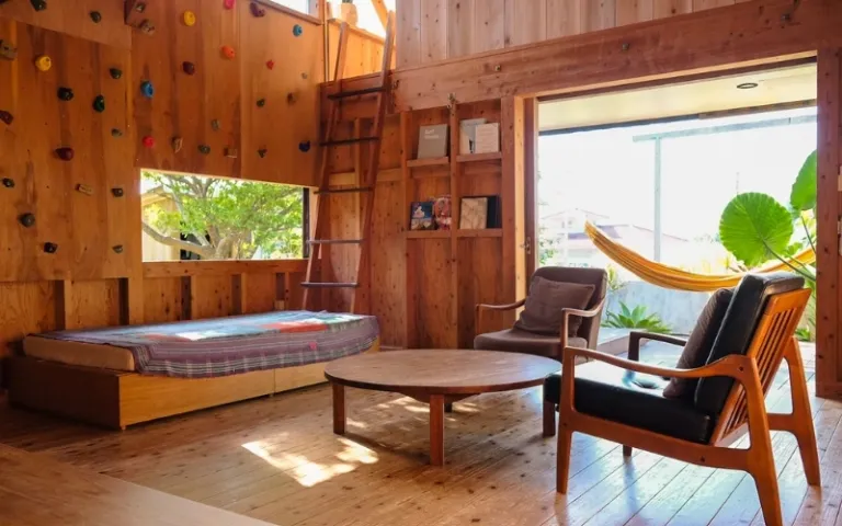 It features a lush garden, a climbing wall, a tea room, a fully-stocked kitchen, and a large open deck where you can relax with a hammock under the sun. Animal lovers are welcome here as well, as the resident cat Chobi likes to keep visitors company every once in a while.