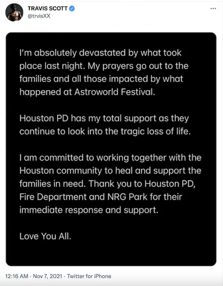 Two days after the Astroworld tragedy, Scott took to Twitter to air his thoughts and grief.