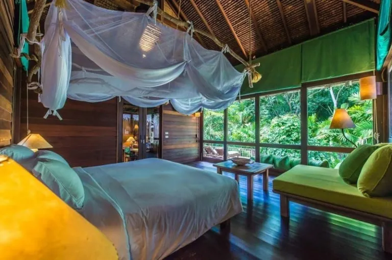 Each exquisite room has a private bathroom, complete with complimentary toiletries and both a bathtub and shower, a TV, DVD player, and iPod docking station. The resort has a swimming pool, tennis courts, and a fitness centre for those feeling active. Young ones can let off steam in the play area, and there’s also an open-air cinema. Activities like snorkelling and kayaking are easy to arrange, and there’s an onsite restaurant. Adding to the charms, some buildings have been constructed around existing trees, preventing humans from interfering with nature.