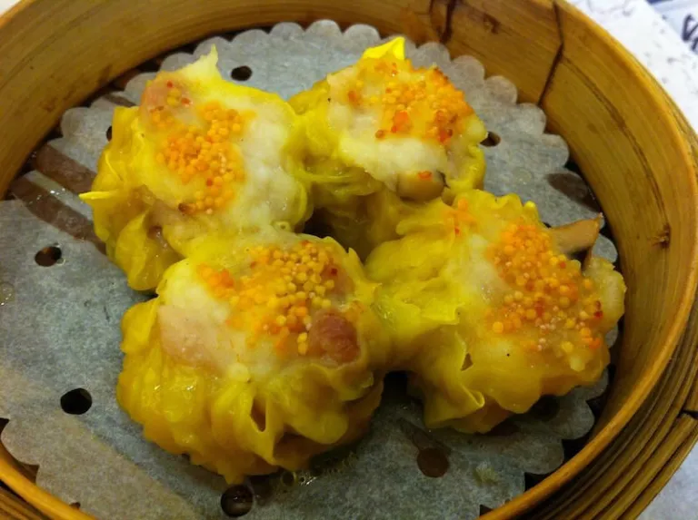 Simply put, siu mai are steamed dumplings that often contain either pork or shrimp. Sometimes, it’s a mixture of both. The meat mixture is wrapped halfway with dumpling skin that has a signature yellow hue. Siu mai often come in sets of three and four.
