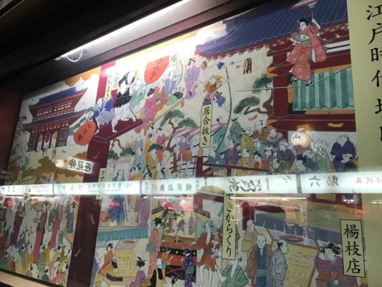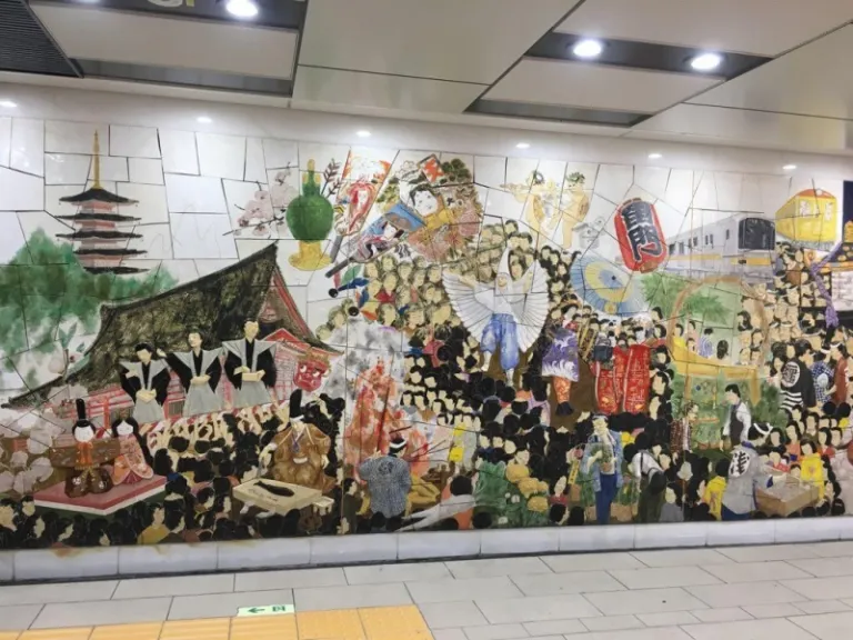 Asakusa is a must-visit, with its quaint streets (and even the subway station) decorated with these aesthetic murals that give a glimpse into Japan’s history. The dense but visually coherent murals ooze a cultural feel, serving the dual purposes of art and storytelling. You can also purchase interesting snacks and souvenirs at Asakusa and watch chefs prepare street snacks through glass windows. Be sure to drop by the renowned Kaminarimon temple, though you may have to jostle with other ardent tourists!
