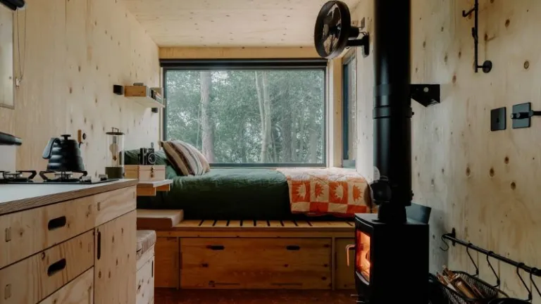 Each cabin offers minimalist accommodations, featuring large windows with sweeping views and a wooden interior. Amenities to keep guests occupied during their phone-free stay include books, board games and a cassette player. The cabins are also equipped with a fridge, gas cooking facilities, a shower, and both indoor and outdoor fireplaces to keep warm. An emergency Nokia phone is provided for calls if needed.