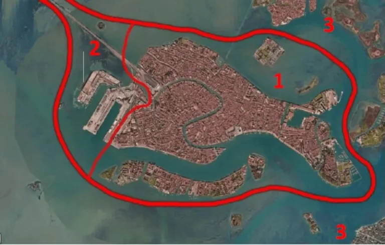 Every individual entering the Ancient City (indicated as no. 1 on the map in the picture above) is required to pay for the Venice entry tickets, unless exempt. Visitors passing through Piazzale Roma, Tronchetto, or Stazione Marittima without entering the Ancient City (area marked as no. 2 on the map) are exempt from paying the fee.