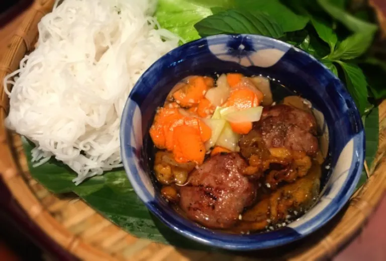 Bun cha is a dish that uses baguette, fresh rice vermicelli noodles, the same noodles used in bun thit nuong, which are soft and easy to chew.