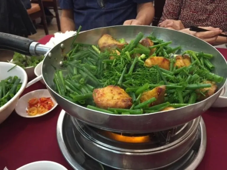 Châ Cá (also known as Châ Cá Lã Vong) is an infamous Hanoi traditional dish. It is a tumeric marinated fish that is first grilled and then fried table-side. It is served with tons of fresh dill, scallions, herbs, crushed peanuts and rice noodles.