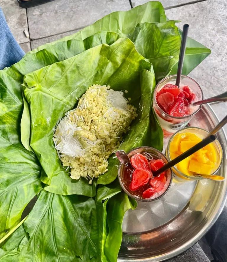 The best specialty to enjoy in Hanoi during the autumn is Cốm. Cốm is leftover rice that is wrapped in lotus leaves to keep the fragrance. The way we enjoy Cốm is also an art. To eat Cốm like local people, you will use five fingers to pick them up little by little. After that, enjoy the delicious Com slowly to feel the mild sweetness and sticky texture.