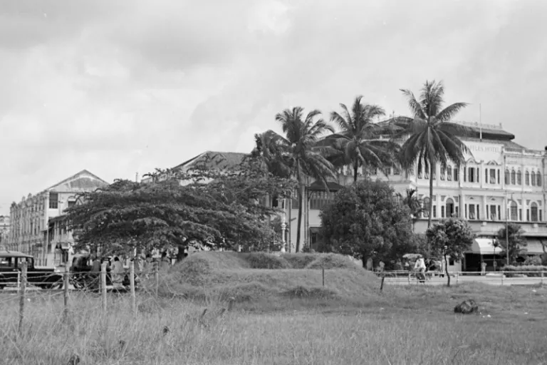 Raffles Hotel fronted by an air raid bunker
