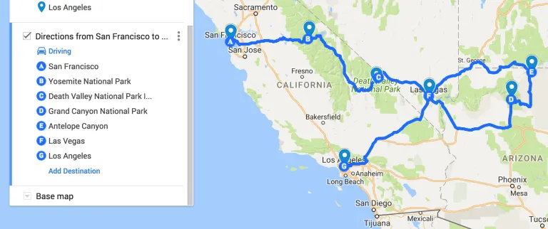 San Francisco > Yosemite NP > Death Valley NP > Grand Canyon NP > Las Vegas > Los Angeles