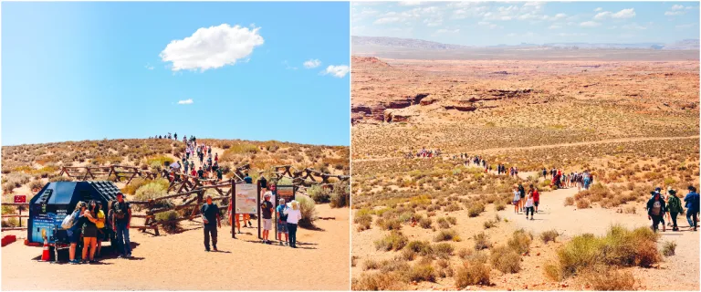 Fun fact: The world-famous Horseshoe Bend is not part of the Grand Canyon, but the Glen Canyon. Though situated about 1.5h outside of the Grand Canyon National Park, the Horseshoe Bend is actually an incised meander of the great Colorado River which runs through the canyon. From the parking lot, it seems like the viewpoint is just a short uphill walk. But in reality, there’s a long downslope before you reach the edge of the cliff for the view. Bring along a bottle of water and relief yourself at the toilet cubicles in the car park before making your way there.