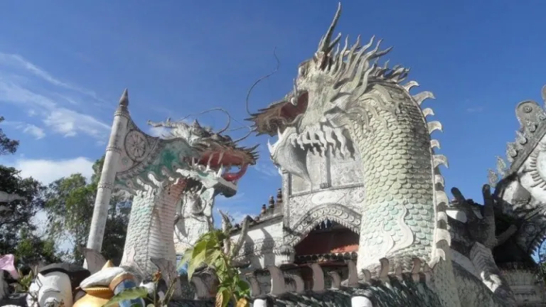 Large dinosaur statues await visitors at the entrance, with large tortoises, naga statues, and other striking stone statues behind. The large pagoda has a gaping mouth at its entrance and there are intricate murals on each level that show the life of the Lord Buddha. The temple has a hell garden too, filled with eye-popping statues that are meant to show what will happen to people in the afterlife if they do not lead a good life in this cycle.