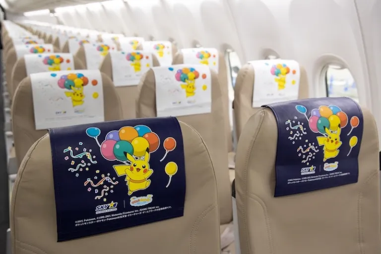 The plane’s exterior already makes us giddy about riding the Pikachu jet. It portrays flying Pikachus being lifted up by balloons, making it seem like Pikachu’s having the time of his life floating in the air. There are many more Pikachu details to discover; passengers will find Pikachu peeking out the windows, on the headrests, pamphlets, cups, and other amenities.