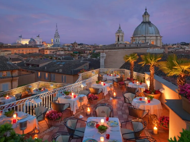 For travellers seeking an idyllic experience, a visit to the rooftop bar of Bio Hotel Raphael, much like the TV characters, is a must. Just imagine the romance in the air when you and your date share a glass of wine while overlooking the city’s skyline and iconic attractions like the 17th-century Fontana dei Quattro Fiumi. As the sun dips below the horizon and casts a warm glow, the entire atmosphere becomes even more sophisticated. The twinkling yellow lights complement the ambience, further elevating your dining experience. Sounds like the highlight of a dream vacation!